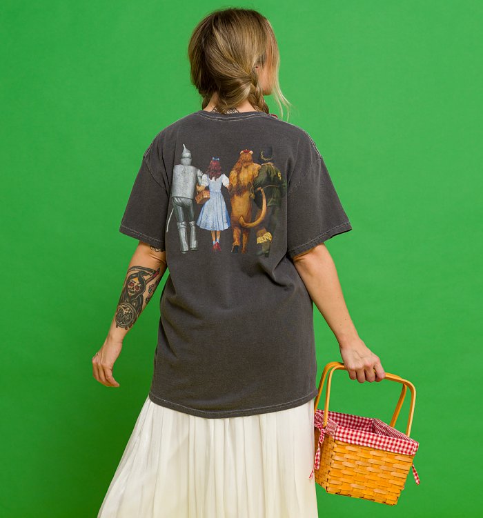 Follow the whole crew on their journey with a fun front print of Dorothy, Scarecrow, The Tin Man and of course, the Lion with the iconic logo, while on the back...
