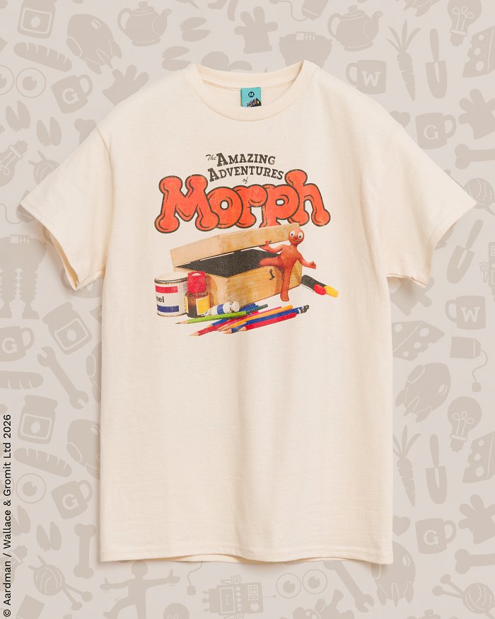 First seen back in 1976, Morph quickly became the star of the iconic show 'Take Hart'. Our very own official Morph t-shirt celebrates 50 years of Aardman magic, featuring our usual top-quality print on a natural base for extra wearability.