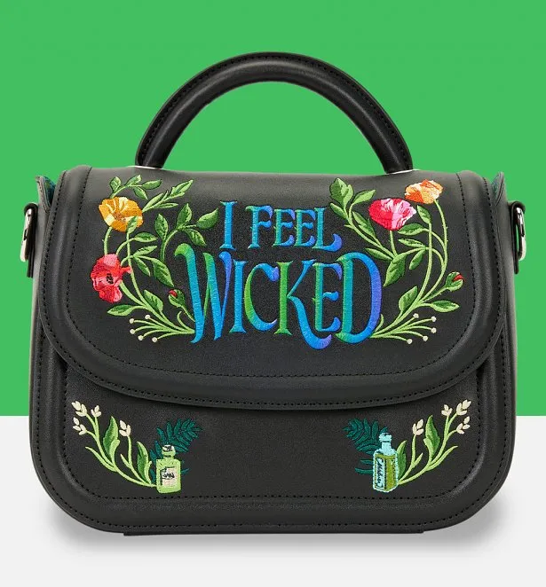 Channel your inner witch with this spellbinding Loungefly crossbody bag, inspired by Wicked: Part Two. Crafted in sleek black faux leather, the front proudly declares “I Feel Wicked” in metallic embroidered lettering, surrounded by vibrant embroidered poppies – a striking nod to the enchanted fields of Oz. With plenty of space for your essentials, this crossbody blends everyday practicality with theatrical flair. Finished with matching poppy embroidery along the sides and a themed lining, it's the perfect way to carry a piece of Ozian magic wherever you go.