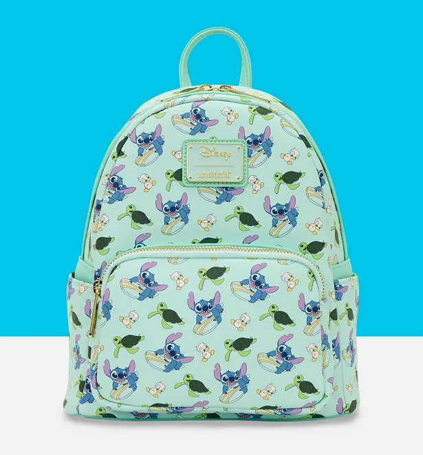 Playful, colourful, and full of island charm – this Loungefly mini backpack brings Stitch and his animal friends to life in the cutest way. Covered in an all-over print featuring Stitch surfing, cuddling his pals, and soaking up the sunshine, it's a joyful nod to his softer side. Finished with a classic mini backpack shape, front zip pocket, and a matching themed lining inside, it's the perfect grab-and-go piece for everyday adventures with Disney's cutest extra-terrestrial.