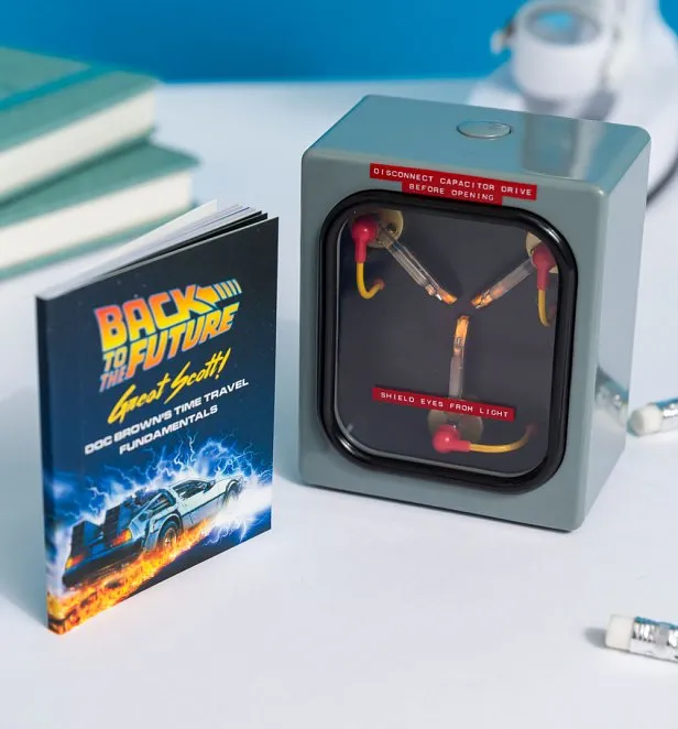Great Scott! Power up your desk, shelf, or DeLorean with this light-up Flux Capacitor from Back to the Future! This officially licensed, mini replica lights up, plays sound effects, and comes with a 32-page book packed with behind-the-scenes trivia and film facts. Perfect for anyone who's been chasing 1.21 gigawatts since 1985.