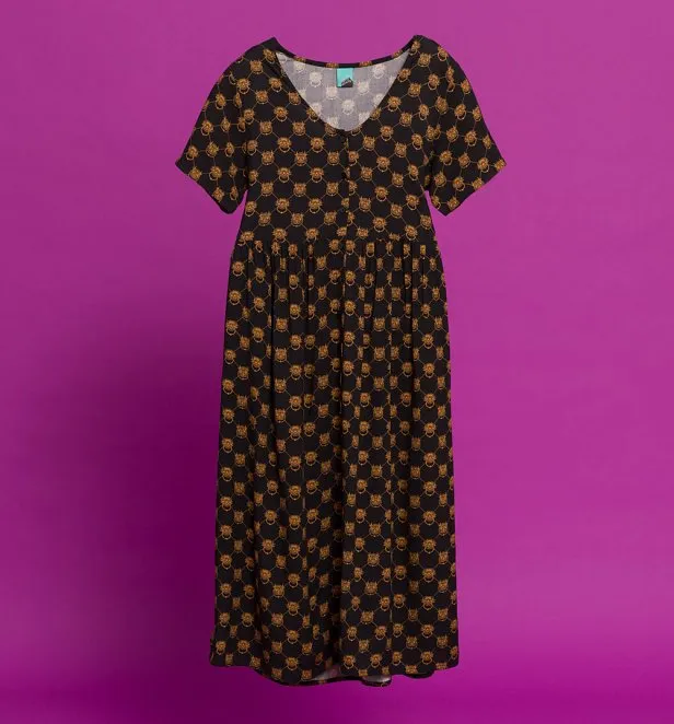 One of the things that's always captivated fans of Labyrinth is its darker, more surreal edge – a side of Jim Henson's world-building that gave the film its unmistakable atmosphere. Few moments capture that tone better than Sarah's encounter with the two door knockers, whose sharp wit and visual impact have become instantly iconic. This beautifully designed midi smock dress takes inspiration from that scene, featuring an all-over diamond-effect print made up of the two knockers throughout. Finished with a flattering V-neckline, button detailing down the front and a swishy skirt, it's part of our special 40th anniversary collection and the perfect way to wear a piece of Labyrinth history.