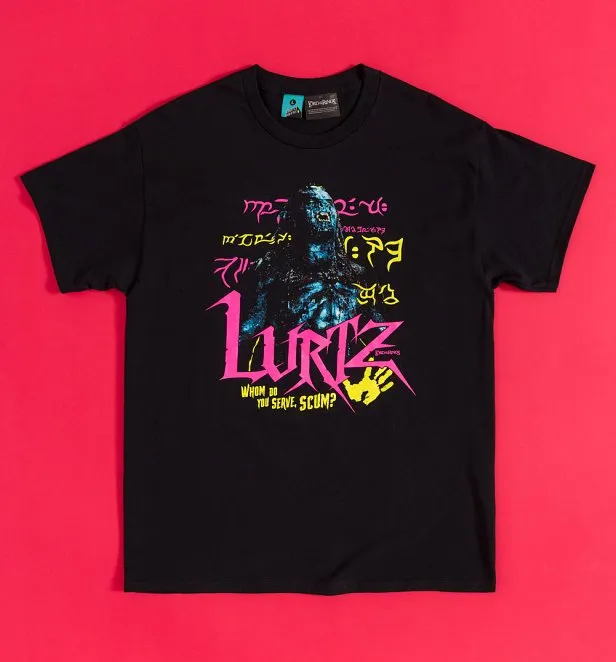 Created by Peter Jackson for The Fellowship Of The Ring, Lurtz quickly became one of the most unforgettable villains in the entire saga. The ruthless Uruk-hai leader makes his mark on this black tee from our 25th anniversary collection, with a bold graphic that captures his brutal presence perfectly. Featuring striking neon lettering, Elvish script and the unforgettable line “Whom do you serve, scum?”, it's a design that hits as hard as Lurtz himself.