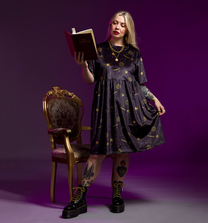 Featuring iconic visual motifs from the cult 80s fantasy classic, this dress is pure perfection, down to the dreamy ruffle detailing. It's the ultimate way to channel your inner Sarah or simply embrace the magic of the Goblin King himself.