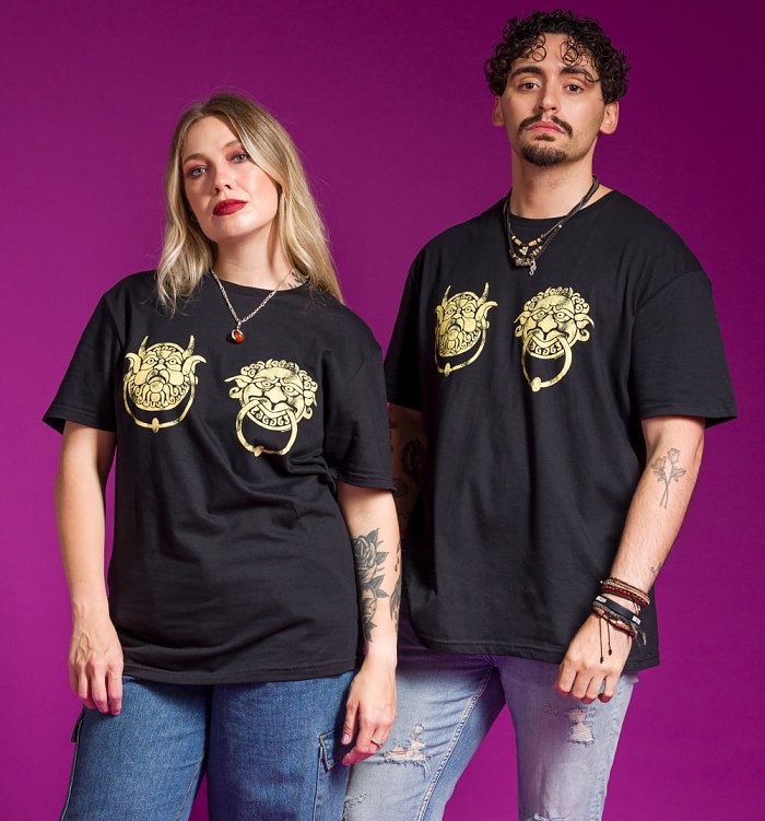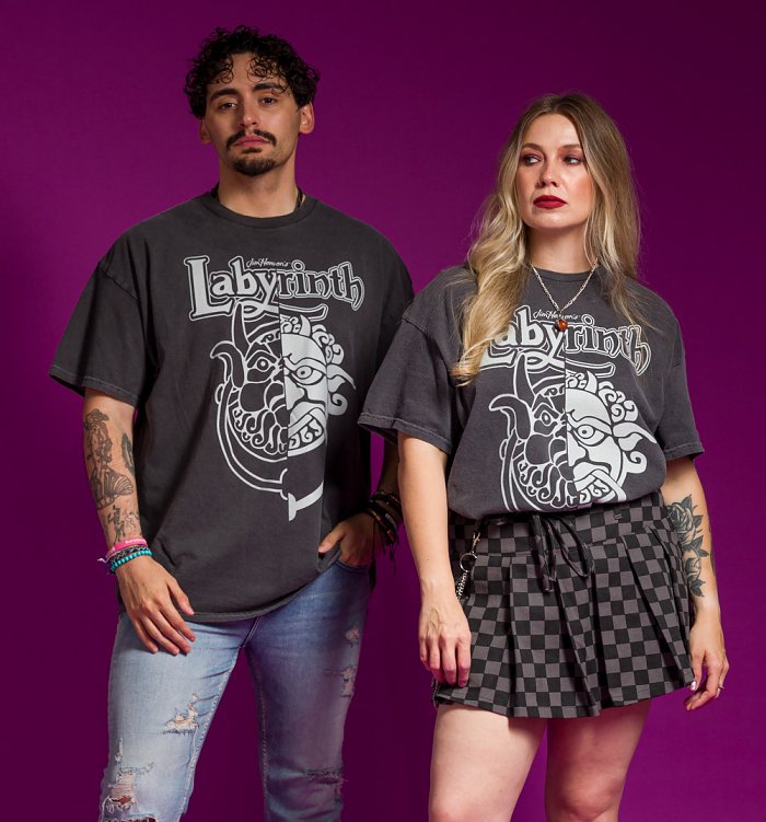 Remember those iconic bickering door knockers Sarah encounters on her journey through the Labyrinth? Well, our awesome Labyrinth Knockers split vintage wash t-shirt featuring a custom split design is a total deep cut nod to this classic scene.