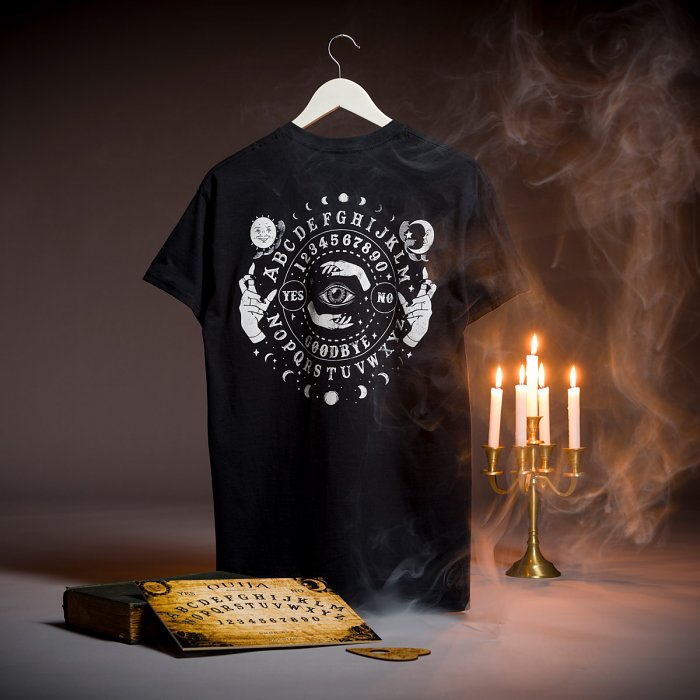 But the real magic is on the back. A full ouija-inspired design packed with celestial symbols, guiding hands, and an all-seeing eye. On our lighty distressed black t-shirt, could you rock this? Watch it guide your hand right to YES! Or, you know... buy now.