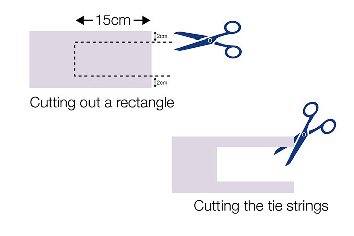 Step 2: With your new cut off, 2cm in from the top and bottom on the two sides, cut into the fabric 15cm. Creating a rectangle which you then need to also cut away. Then stip the remaining joint 2cm strips of fabric in the middle or where they're folded from.