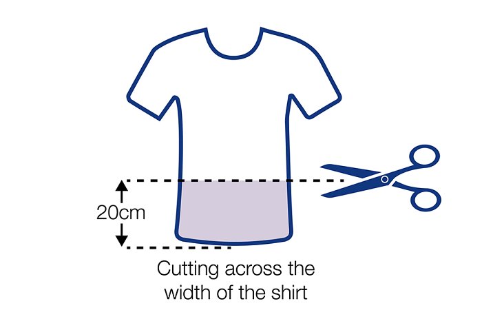 Lay the tshirt flat then cut a straight line across the width of the T-shirt (front and back) approximately 20cm up from the bottom hem.